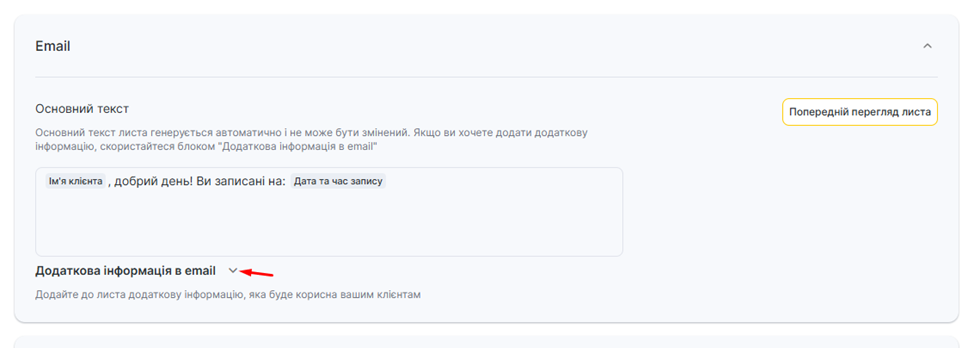 Щоб додати додатковий текст, перейдіть на вкладку Додаткова інформація в Email.