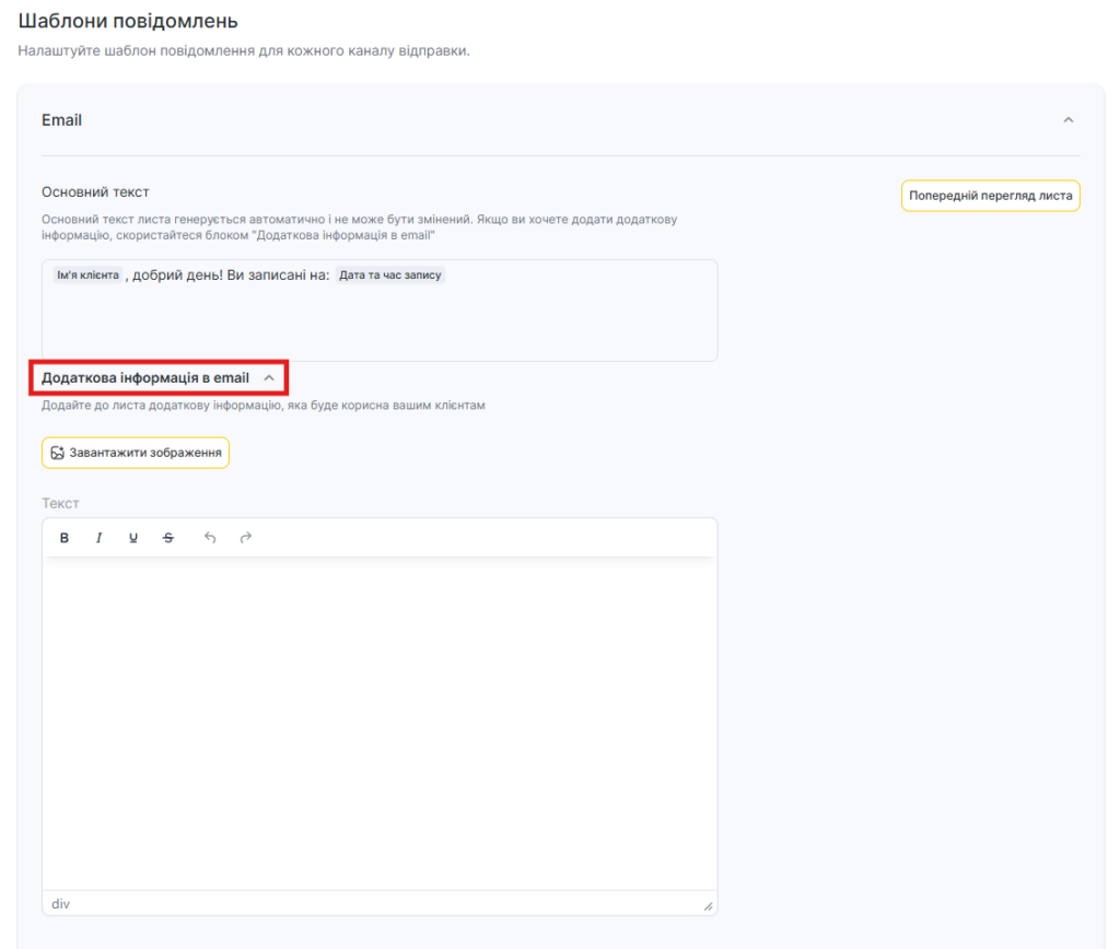 - Для каналу Email редагування шаблону недоступне, але можна додати додаткову інформацію. Для цього: