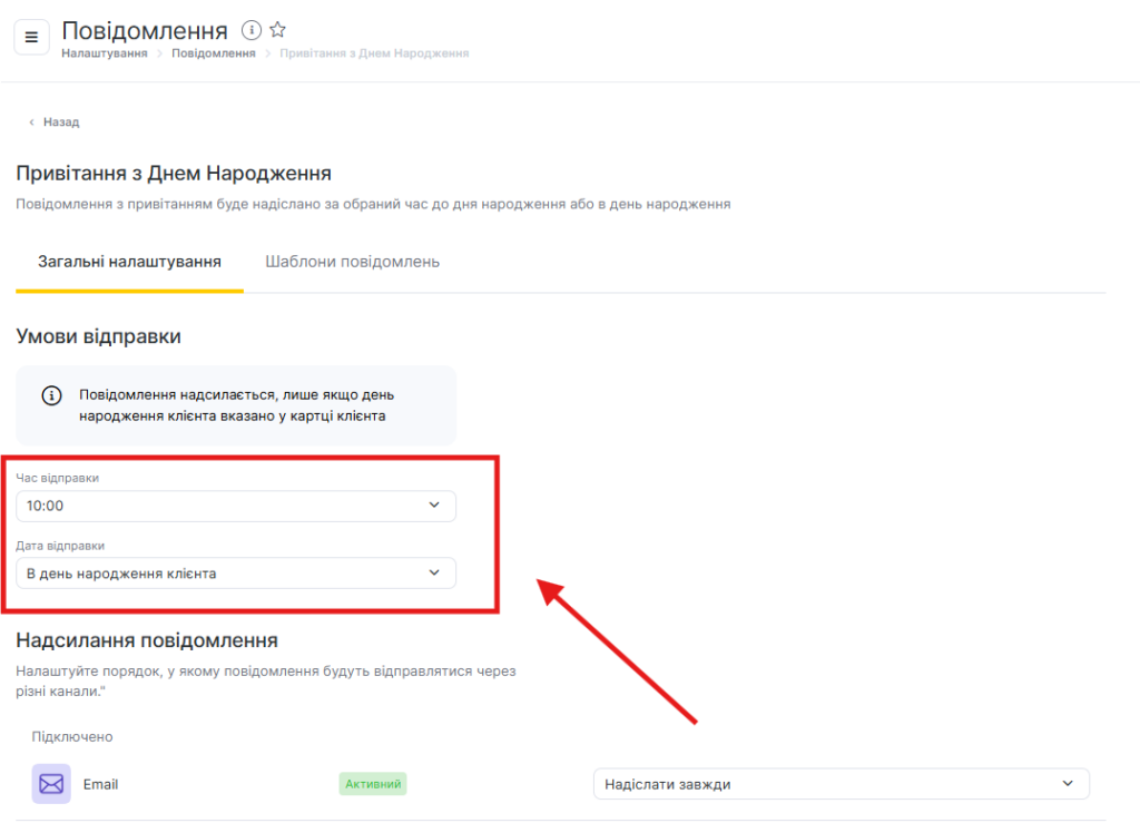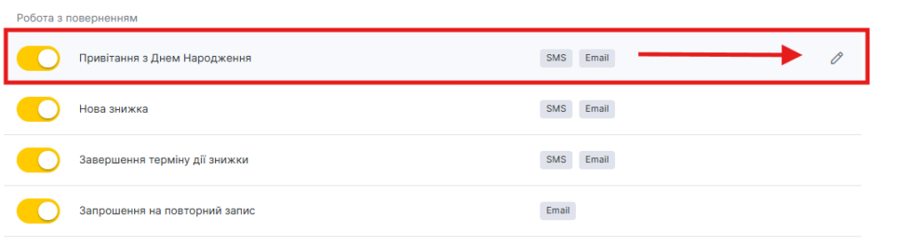 - У блоці Клієнту → Робота з поверненням клієнтів виберіть тип Привітання з днем народження, натиснувши на назву сповіщення або іконку олівця.