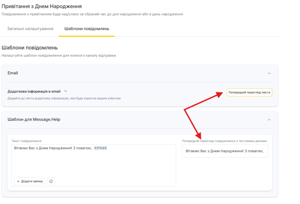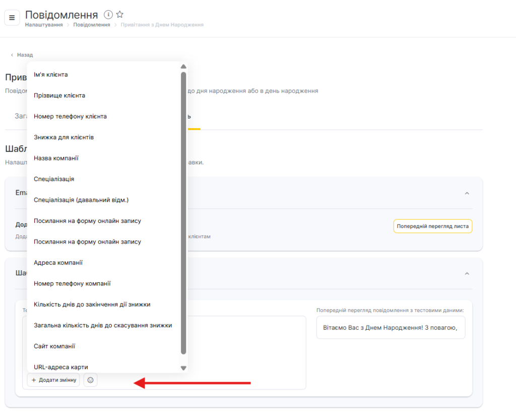 - Для всіх шаблонів сповіщень доступний попередній перегляд — як виглядатиме повідомлення під час відправлення клієнту, співробітнику або адміністратору з урахуванням змінних.