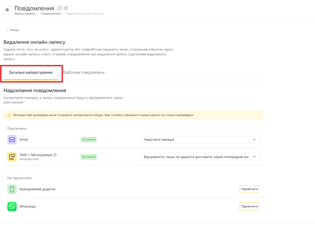 - На вкладці Загальні налаштування налаштуйте, як саме будуть надсилатися сповіщення через кілька каналів.