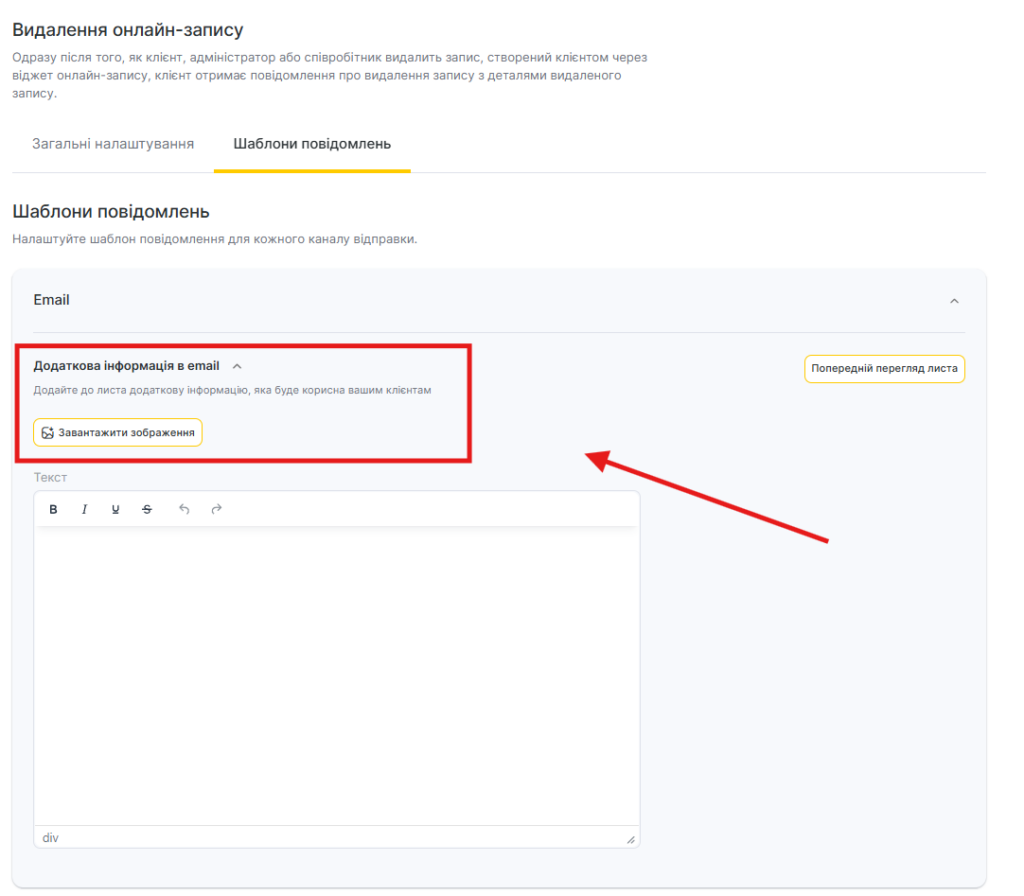 - Для каналу Email редагування шаблону недоступне, але можна додати додаткову інформацію. Для цього: