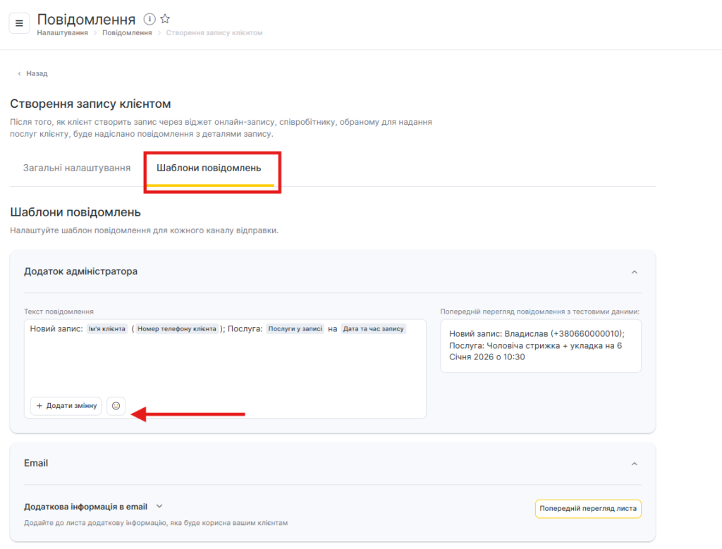 - Для всіх шаблонів сповіщень доступний попередній перегляд — як виглядатиме повідомлення під час відправлення клієнту, співробітнику або адміністратору з урахуванням змінних.