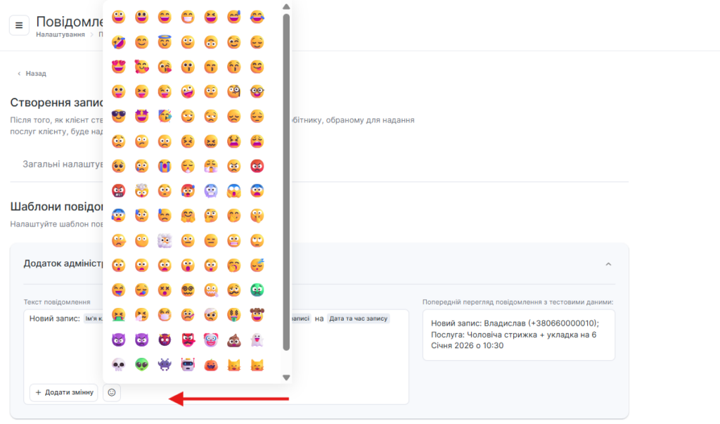 У SMS-шаблонах сповіщень ви можете використовувати Emoji, для цього натисніть кнопку зі смайлом і виберіть потрібний із запропонованих або додайте власний.