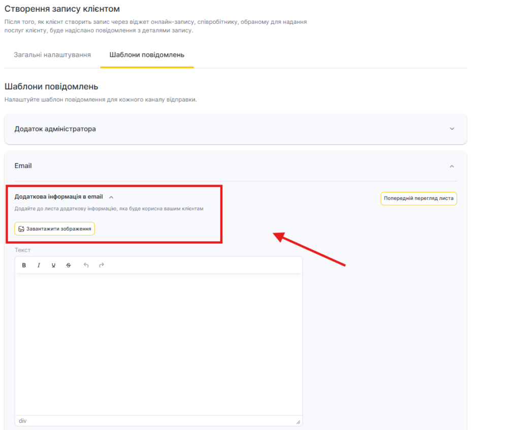 - Для каналу Email редагування шаблону недоступне, але можна додати додаткову інформацію. Для цього: