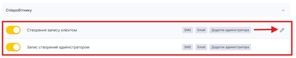 - У блоці Співробітнику виберіть тип Створення запису клієнтом або Створення запису адміністратором та натисніть на кнопку Змінити із зображенням олівця.