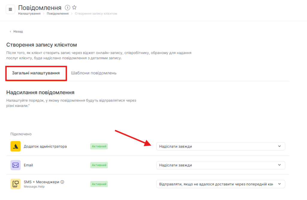 - На вкладці Загальні налаштування налаштуйте, як саме будуть надсилатися сповіщення через кілька каналів.