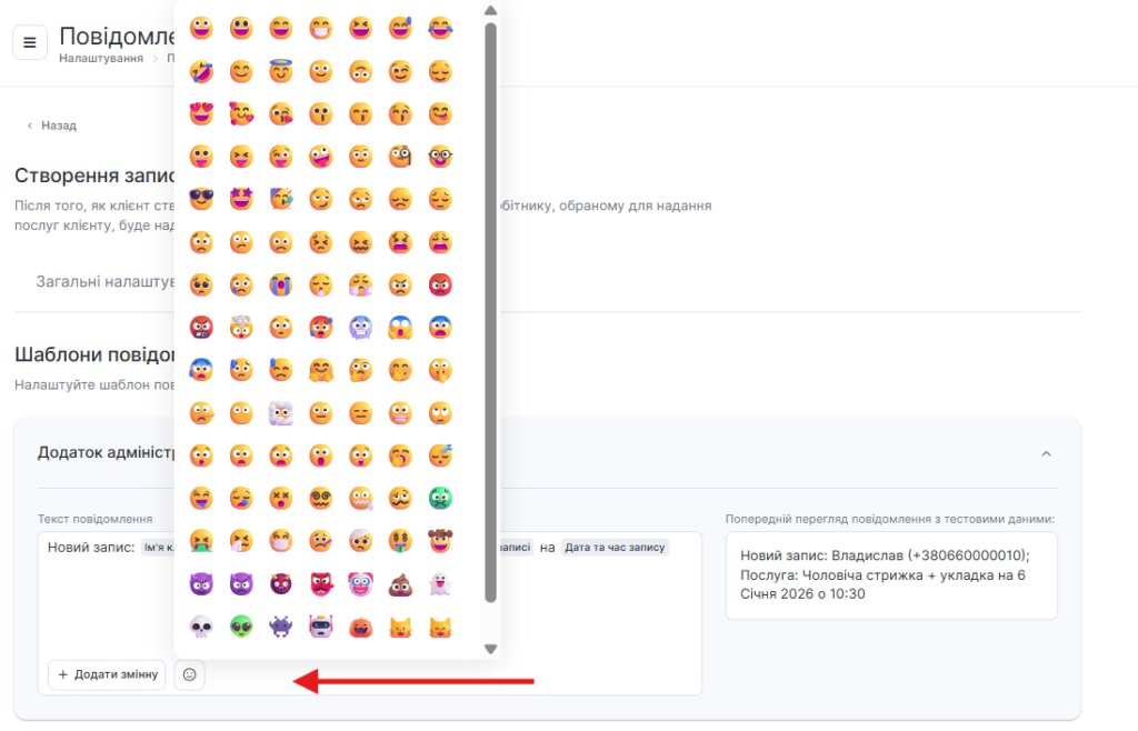 У SMS-шаблонах сповіщень ви можете використовувати Emoji, для цього натисніть кнопку зі смайлом і виберіть потрібний із запропонованих або додайте власний.