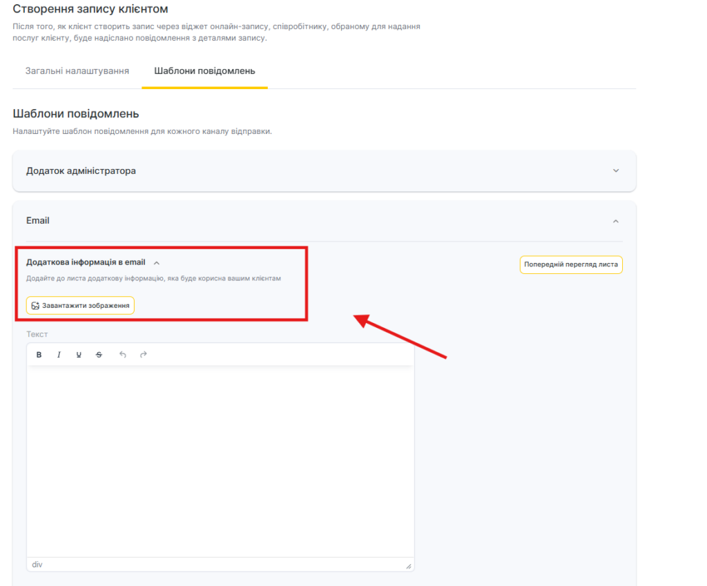 - Для каналу Email редагування шаблону недоступне, але можна додати додаткову інформацію. Для цього: