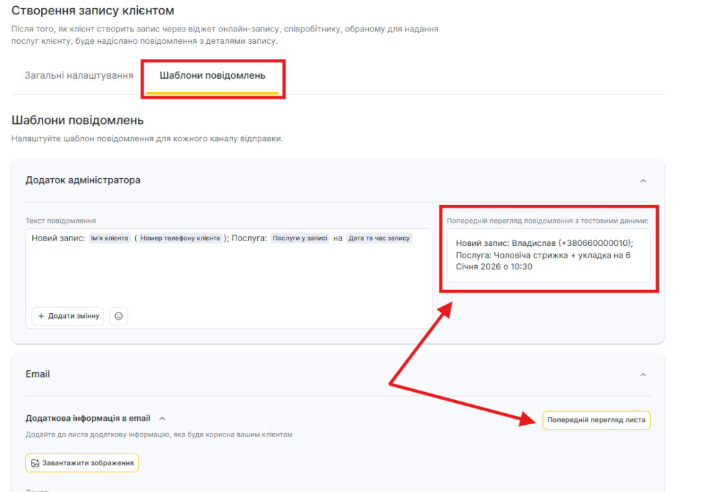 Для всіх шаблонів сповіщень доступний попередній перегляд — як виглядатиме повідомлення під час відправлення клієнту, співробітнику або адміністратору з урахуванням змінних.