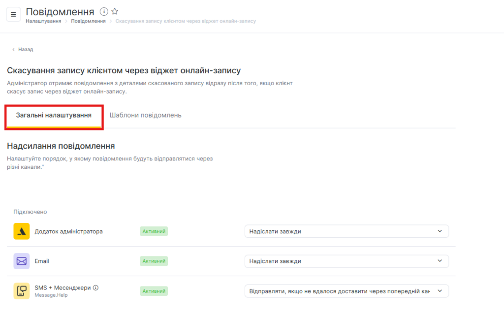 - На вкладці Загальні налаштування налаштуйте, як саме будуть надсилатися сповіщення через кілька каналів.