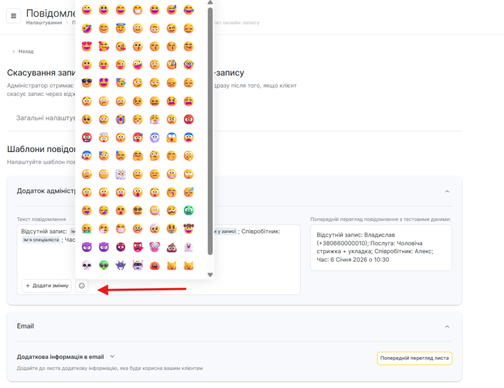 У SMS-шаблонах сповіщень ви можете використовувати Emoji, для цього натисніть кнопку зі смайлом і виберіть потрібний із запропонованих або додайте власний.