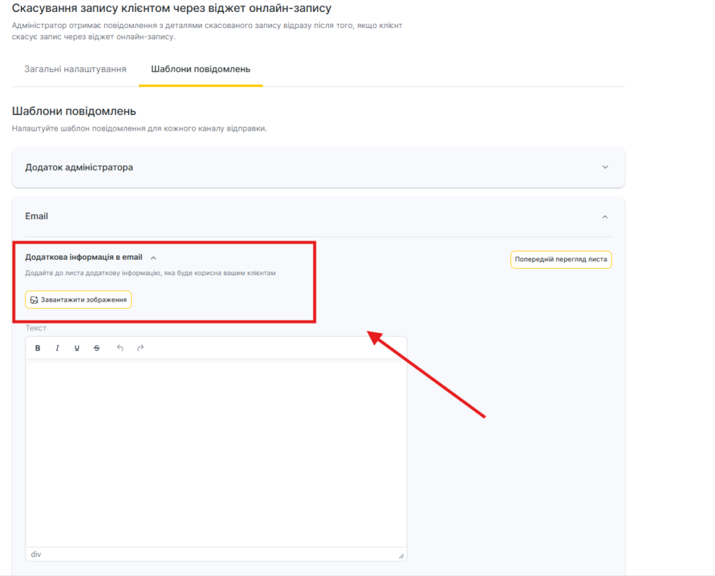 - Для каналу Email редагування шаблону недоступне, але можна додати додаткову інформацію. Для цього: