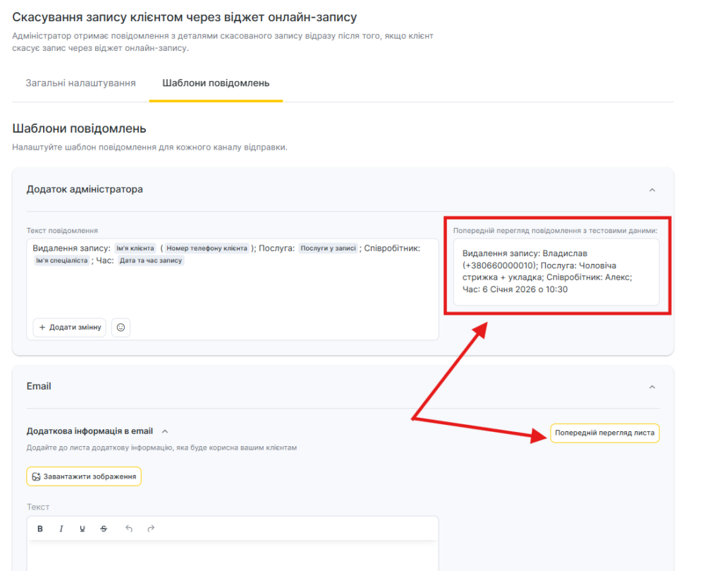 Для всіх шаблонів сповіщень доступний попередній перегляд — як виглядатиме повідомлення під час відправлення клієнту, співробітнику або адміністратору з урахуванням змінних.