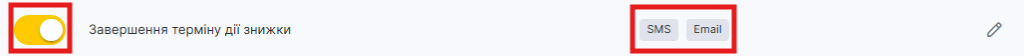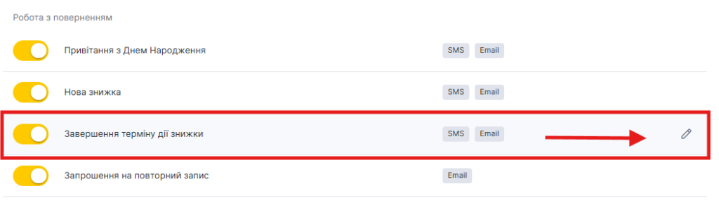 Налаштування > Системні налаштування > Повідомлення, вкладка Типи повідомлень. - У блоці Клієнту > Робота з поверненням виберіть тип Завершення терміну дії знижки, натиснувши на назву сповіщення або іконку олівця.