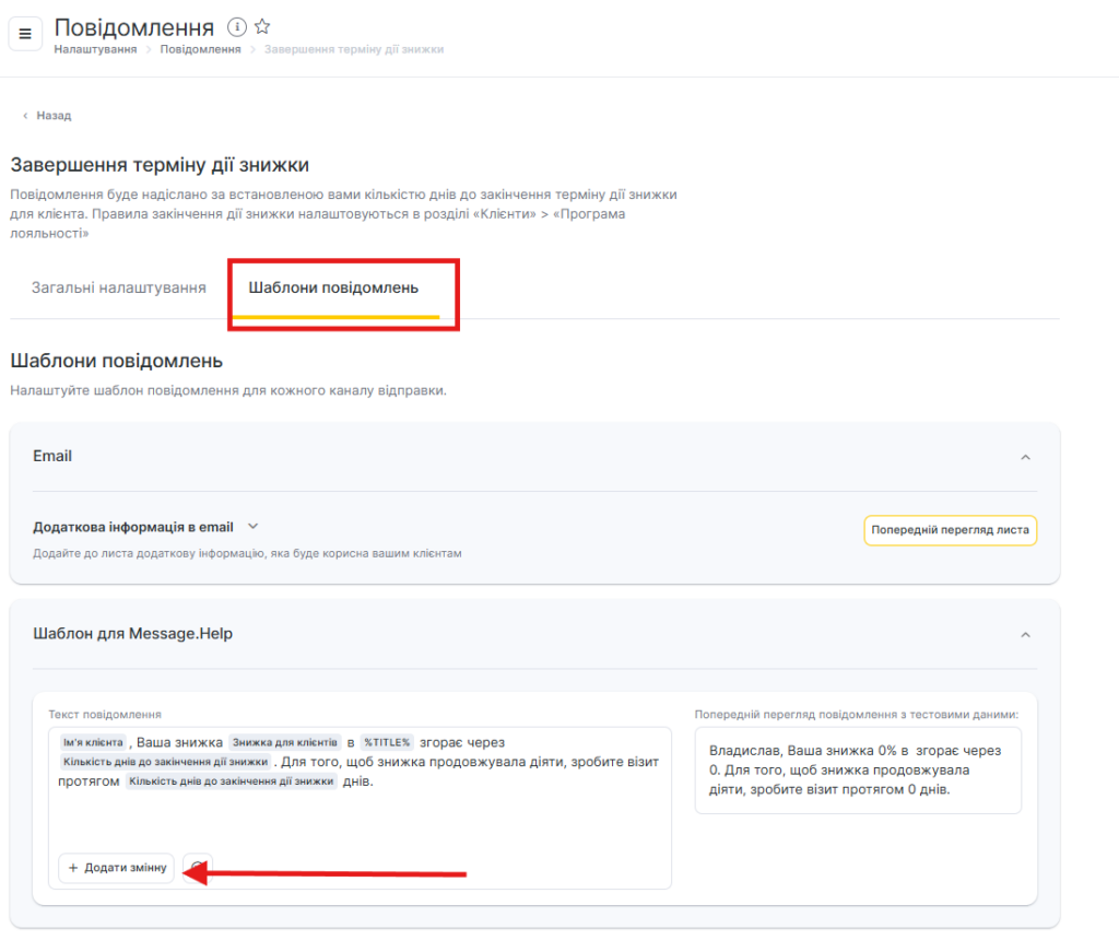 Для всіх шаблонів сповіщень доступний попередній перегляд — як виглядатиме повідомлення під час відправлення клієнту, співробітнику або адміністратору з урахуванням змінних.