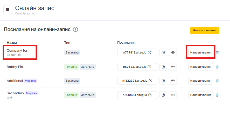 - Щоб знайти поле «Meta (Facebook) Pixel» в Altegio, перейдіть до розділу Онлайн-запис > Посилання на онлайн-запис, після чого виберіть потрібний віджет, натиснувши на назву або кнопку Налаштувати.