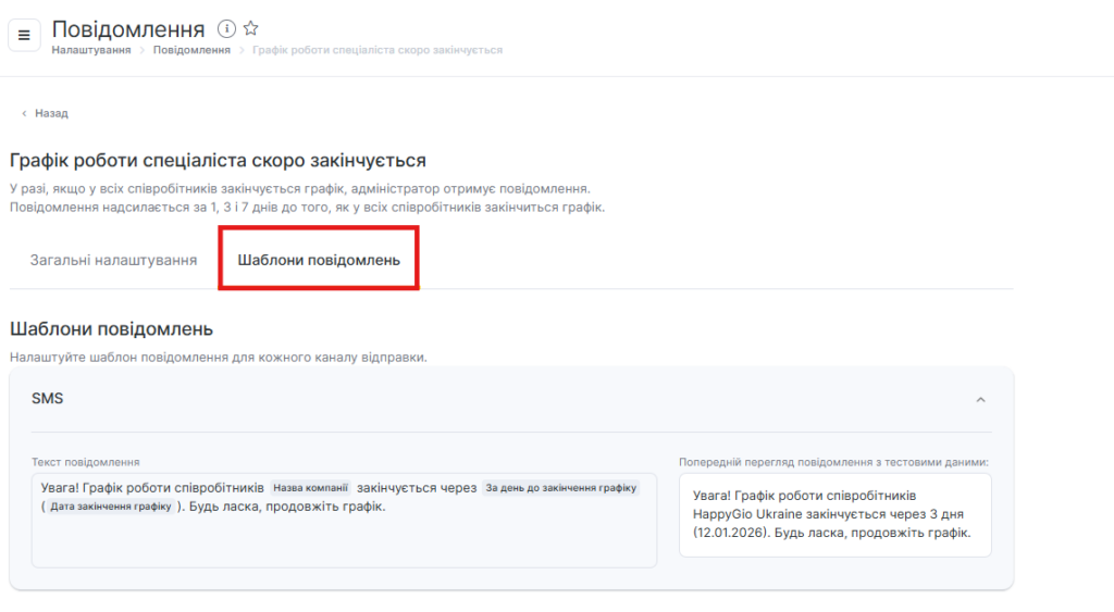 Повідомлення цього типу відправляються 3 рази: за 7 днів, за 3 дні і за 1 день до закінчення дії розкладу. Важливо відзначити, що повідомлення надсилається, коли завершується весь розклад філії. Якщо у філії 10 співробітників, і у 9 немає розкладу, а у 1 ще є, то ці повідомлення не приходять. Канал відправки повідомлення — SMS.