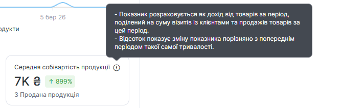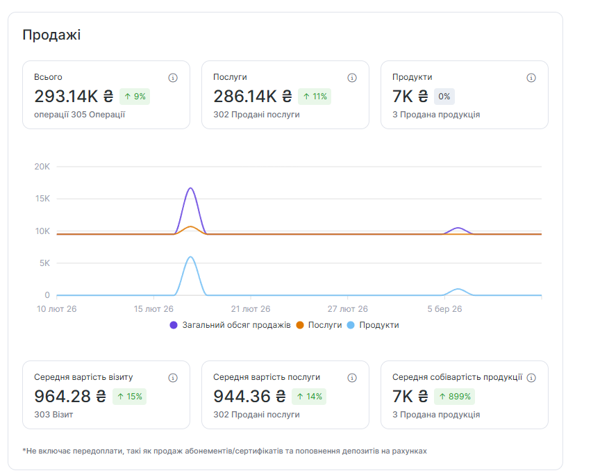 Середня вартість візиту – Розраховується за формулою: (Виручка за послугами + виручка за товарами) ÷ (візити з клієнтами + записи без клієнтів + продажі товарів).