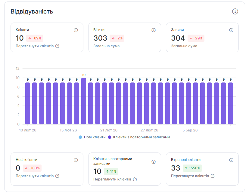Блок Відвідуваність відображає активність клієнтів за вибраний період і допомагає оцінити динаміку візитів та клієнтської бази.