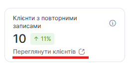 Клієнти з повторними записами — кількість клієнтів, які здійснили другий і наступні візити за вибраний період.