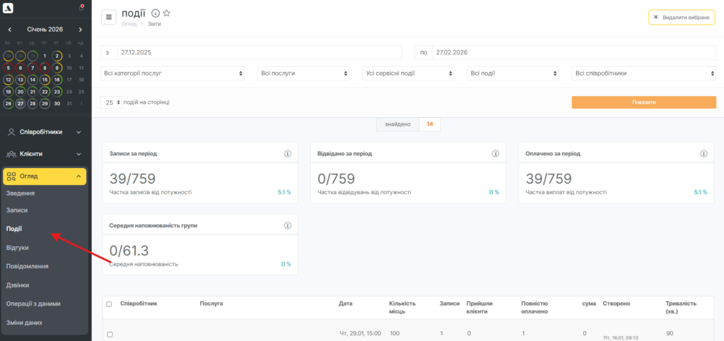 У розділі Огляд > Події відображається інформація про всі події (групові записи), створені в Altegio.