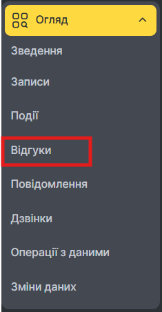У розділі Огляд > Відгуки відображається інформація про всі відгуки, які залишили клієнти філії в Altegio. Серед них — відгуки, залишені як в описі компанії, так і в описах співробітників.