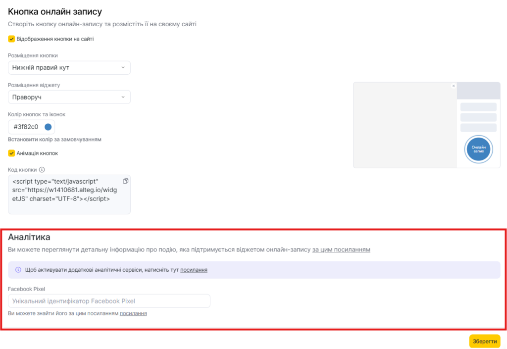 Налаштувати цей процес ви можете у розділі Онлайн-запис > Посилання для онлайн-запису у блоці Аналітика у формі онлайн-запису, вказавши унікальний ідентифікатор сервісу.