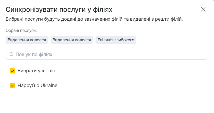Якщо виникла потреба зробити послуги філії мережевими, наприклад, потрібно додати окремі послуги в акцію чи сертифікат, можна скористатися функцією синхронізації. Також синхронізація допоможе привести список мережних послуг до однаковості у всіх філіях — додати послуги до потрібних філій та видалити з філій, де ці послуги не потрібні.