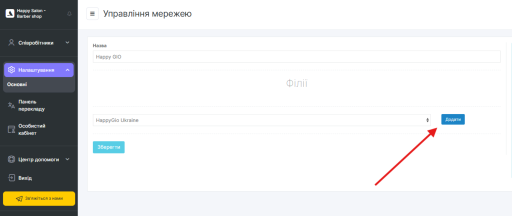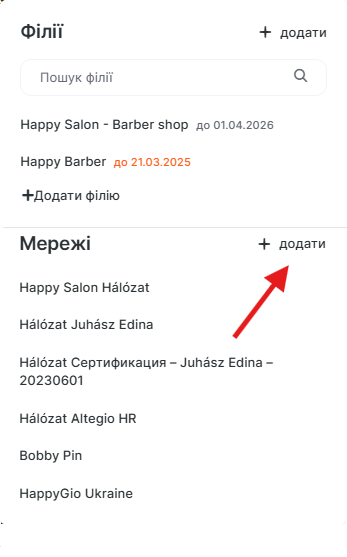 - Натисніть на назву філії (або мережі, якщо ви вже перебуваєте в інтерфейсі створеної мережі) і в розкривному меню в блоці Мережі натисніть Додати.