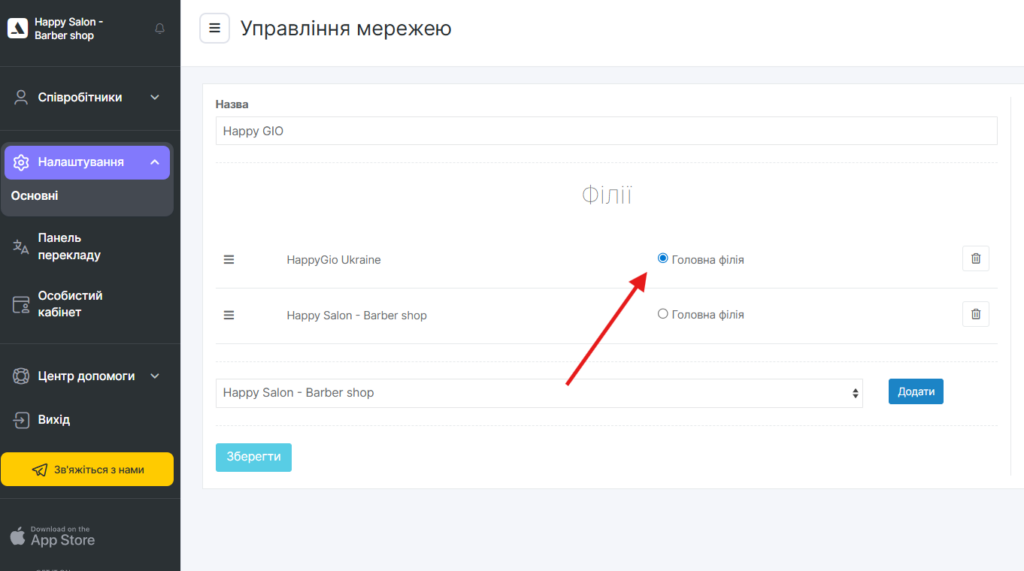 Altegio автоматично перенаправить вас на сторінку керування мережею в розділ Налаштування > Основні (у мережевому інтерфейсі).