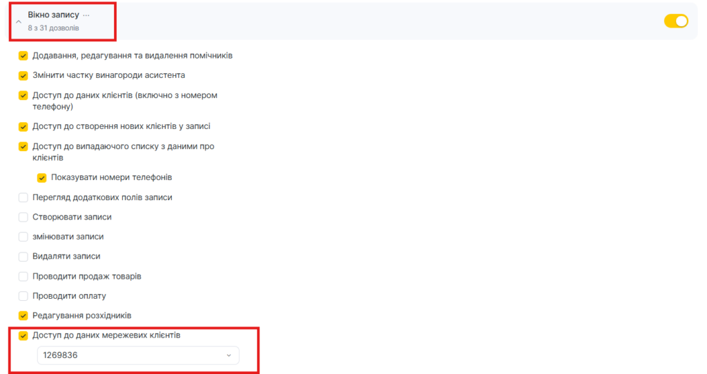 У розділі Вікно запису є пункт Доступ до даних клієнтів по мережі. Установіть прапорець, якщо хочете, щоб співробітник мав доступ до перегляду даних клієнтів. Виберіть мережу, по якій цьому співробітнику будуть доступні дані клієнтів. Щоб заборонити доступ, зніміть прапорець.