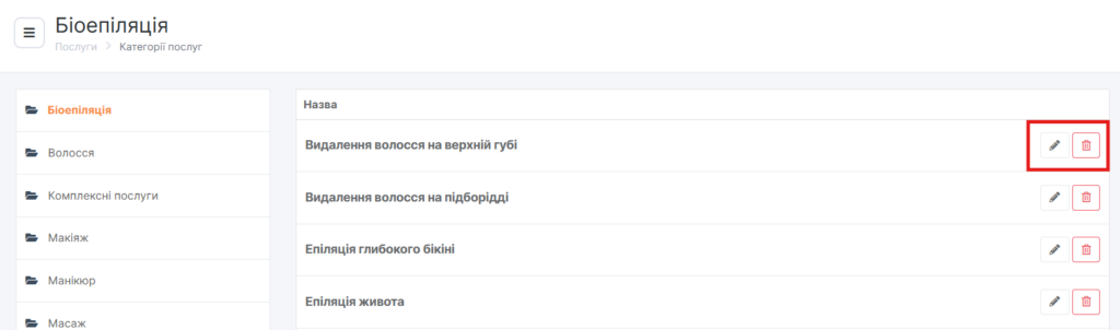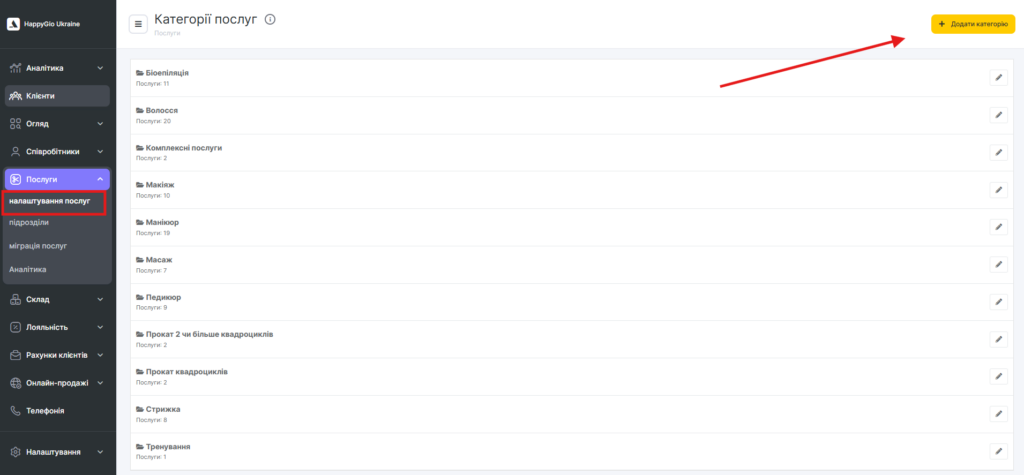- Додайте послуги до категорії. Для цього натисніть на назву категорії — з’являться кнопки Додати послугу, натисніть будь-яку з них.