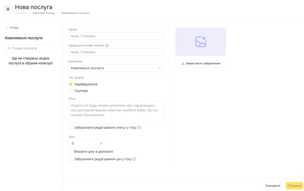 - Вкажіть назву послуги та назву для онлайн-запису (цю назву бачитимуть клієнти під час онлайн-запису; якщо поле залишити порожнім, буде використано основну назву послуги). Оберіть категорію, до якої належить послуга. Вкажіть, чи буде ця послуга доступна для групового запису. Додайте зображення, яке відображає суть послуги.
