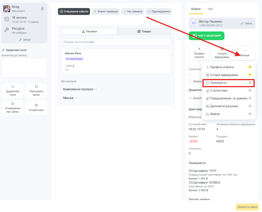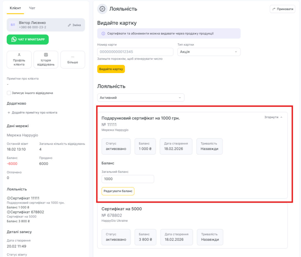 Оновлений баланс сертифіката можна переглянути в розділі Лояльність у картці клієнта.