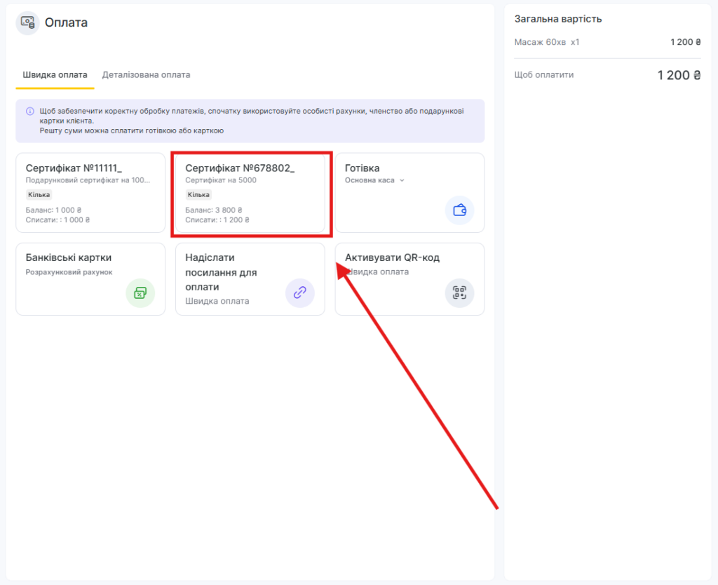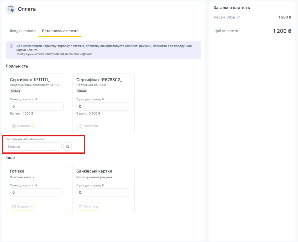 Якщо сертифікат не прив’язаний до клієнта, його можна використати, ввівши код на вкладці Деталізована оплата.