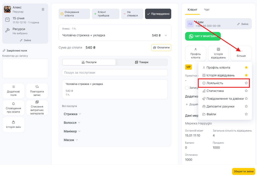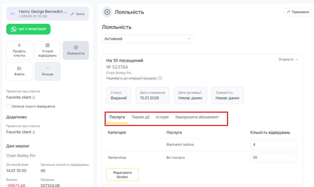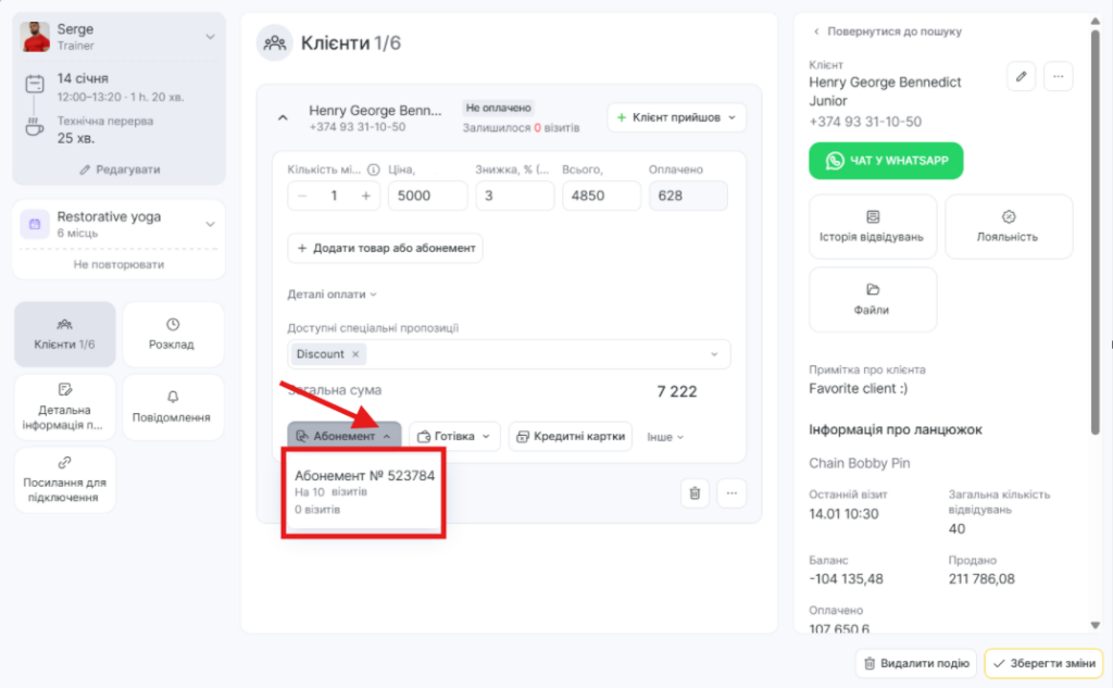 - У блоці Лояльність відобразяться абонементи, які можна застосувати до запису, якщо вони є у клієнта.