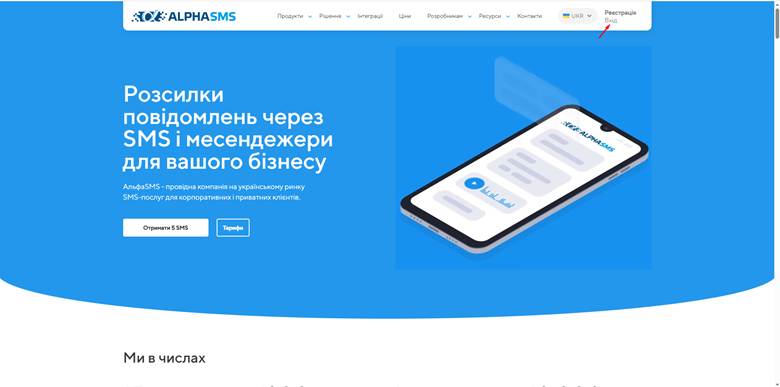 1. Перейдіть на сайт https://alphasms.ua./uk/ і натисніть на кнопку Реєстрація.