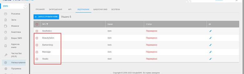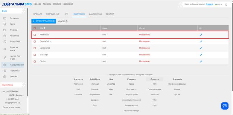 5. У функціонал сервісу входить вибір динамічного ім’я відправника, з можливістю використання цифр та літер латинського алфавіту або підбір загального імені відправника.