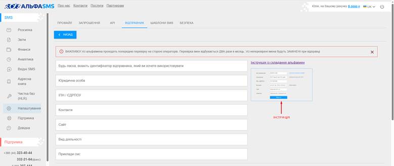 Для створення власного альфаімені необхідно заповнити анкету в відповідному розділі Особистого кабінету AlphaSMS: