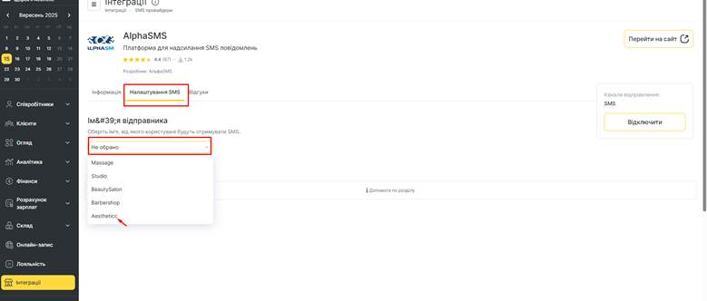 Після підтвердження вашого Альфа імені і налаштування інтеграції треба обрати відправника в системі Altegio.