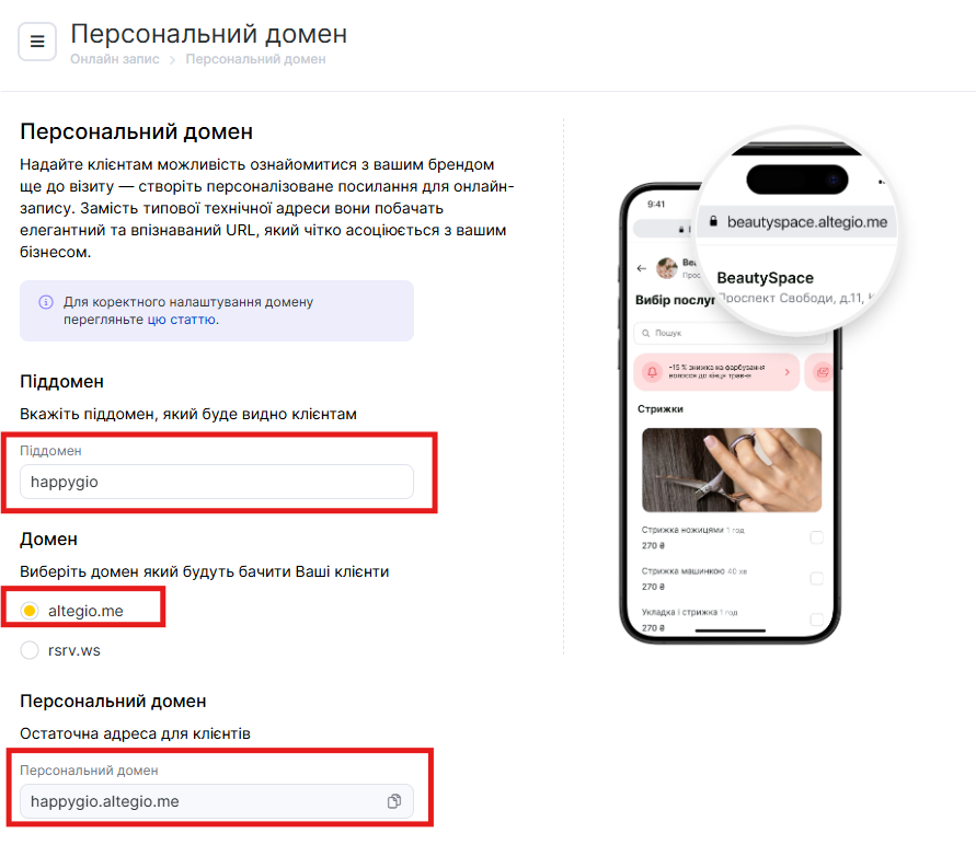 Поле Персональний домен показує готове посилання, яке бачитимуть клієнти.